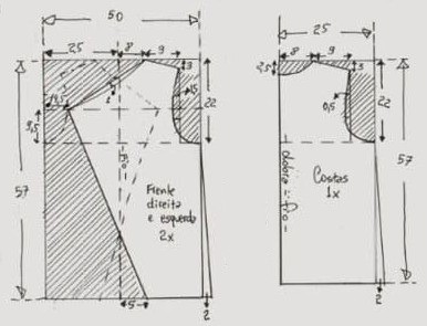 * "Frente derecho y esquerdo 2x" (Delantero derecho e izquierdo 2 veces): Esta es la plantilla para la parte delantera de la blusa. Indica que se deben cortar dos piezas, una para el lado derecho y otra para el izquierdo (generalmente simétricas). La línea punteada central sugiere el doblez de la tela para cortar ambas partes a la vez si son simétricas.